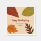 Feliz Día de Acción de Gracias está en el centro en un guión cursivo. El texto adicional que no está en un guión para un nombre se encuentra bajo Feliz Día de Acción de Gracias. Hojas de otoño rodean el texto para formar una hermosa paleta de colores otoñales como naranja, verde y marrón. El pegatina es beige. Todo el texto se puede editar o eliminar.