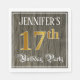 Este elegante y lujoso diseño de servilletas de papel temático para cumpleaños incluye un nombre editable y el mensaje "Fiesta de cumpleaños número 17". El gran número "17th" tiene un patrón de color inspirado en el oro de imitación/imitación, y las palabras "Birthday Party" están en un texto ornamental. El fondo tiene un patrón imitación/falso inspirado en el grano de madera. Unas servilletas de papel ornamentadas como esta podrían ser útiles para tener en una fiesta de cumpleaños/celebración para celebrar el cumpleaños diecisiete de alguien. [~Z0000566]