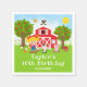 Esta servilleta linda y divertida presenta a una chica de cabello rubio con piel clara junto a un granero rojo con una veleta de gallo. Hay adorables animales de granja como una vaca, un cerdo y una gallina. Al fondo hay un cielo azul brillante, manzanos, sol, mariposas y margaritas. El texto combina fuentes en negrita y sans serif para un look elegante y moderno. Esto es perfecto para una fiesta de cumpleaños con tema de granja.