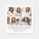 Una servilleta de graduación boho simple y elegante con un collage de cinco fotos para un toque personalizado. El diseño muestra cinco fotos cuidadosamente dispuestas, enmarcadas por un fondo blanco limpio con texto gris suave. "Clase de 2026", el nombre del graduado y la escuela se muestran en fuentes discretas y sofisticadas, lo que añade un toque refinado.