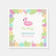 Flores y hojas tropicales, con frutas y un bonito flotador flamingo para el perfecto fiesta de piscina chica.