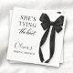 Servilletas de fiesta diseñadas con un clásico motivo de lazo negro y la frase ella se está casando. Creado para un look limpio y elegante que combina bien con la decoración de boda en blanco y negro. Adecuado para fiestas de despedida de soltera, fiestas de compromiso, reuniones de chicas y celebraciones de boda. Texto totalmente personalizable con un diseño listo para imprimir para servilletas de cóctel o almuerzo.