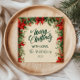 Un diseño fiesta Navidad festivo enmarcado con poinsettias rojas clásicas, ramas de pino y vegetación de invierno. El estilo rústico vintage capta la calidez y la comodidad de la temporada de vacaciones, perfecta para una celebración tradicional de Navidades.