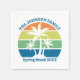Estas frescas toallas fiestas personalizadas de la puesta de sol en la playa tropical cuentan con 3 palmeras en forma de silueta frente a un cielo naranja y azul acentuado con amarillo y verde en la costa. Personalizar con su nombre de viaje familiar para su escapada costera en primavera o verano o vacaciones de crucero oceánico.