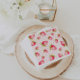 Cuidados, acuarelas, boho dulce fresa fiesta platos de decoración. Se han elegido todos los elementos para traer buenas vibraciones, con una mezcla de colores veraniegos: rosa caliente, rosa pálido y verde césped. El encantador entorno con puntos hace que este diseño sea perfecto para las celebraciones de fiestas de verano.