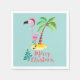 servilletas de papel con un lindo ilustracion de un flamingo rosado en un sombrero de santa rojo. Junto a una palmera verde sobre un montón de arena amarilla. Se coloca un diseño de flamante árbol de navidad junto al texto Feliz Navidad. Escrito en el color rosa en un lujoso tipo de letra manuscrita. Fondo verde pastel.