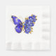 Joyería, azul, zafiro, mariposa floral brillante con ala decorada con flores azules y preciosas con hojas de oro sobre fondo blanco.