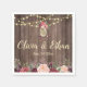 Una servilleta de estilo rústico con luces de cuerda, tarro de albañil y rosas de color acuático sobre un fondo de madera. Puede personalizar el estilo de letra y la ubicación de cualquier forma que desee haciendo clic en el botón "personalizar". Forma parte de una hermosa suite boda que puede ser totalmente personalizada.