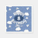 This whimsical paper napkin for a boy's or girl's birthday party features various illustrated folded white paper airplanes with dashed-line flight trails amongst puffy white clouds on a customizable blue background - personalize with your child's name & age - by katz_d_zynes