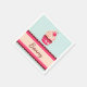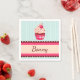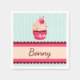 Toallas de papel con quequitos rosados y cereza sobre fondo a rayas azules de menta.