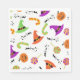 Fundido pañuelo de papel de Halloween con caramelos, calabazas y gorras de brujas en naranja, verde y morado sobre un fondo blanco. Esta servilleta sería genial para una fiesta de cumpleaños temática de Halloween o una fiesta de Halloween.