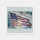 Esta imagen norteamericana, de bandera, está resaltada en contra, fuegos artificiales reventando, en una colorida exhibición de bengalas rojas, blancas, azules y amarillas, en un cielo nublado y crepúsculo, de pizarra azul.