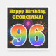 Este divertido y vibrante diseño de servilletas de papel presenta un colorido patrón inspirado en fuegos artificiales de celebración, junto con el número "96" que tiene un arcoiris multicolor como patrón gradiente, sobre un fondo de color negro. También incluye un nombre personalizado y un mensaje de evento. Las servilletas de papel como esta podrían ser usadas en una fiesta de cumpleaños que se lleva a cabo para celebrar el cumpleaños noventa y seis de alguien. [~Z0000326]