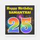 Este divertido y vibrante diseño de servilletas de papel presenta un patrón colorido inspirado en fuegos artificiales de celebración, junto con el número "25", que presenta un patrón multicolor de arcoiris como gradiente, sobre un fondo de color negro. También incluye un nombre personalizado y un mensaje de evento. Las servilletas de papel como esta podrían ser usadas en una fiesta de cumpleaños para celebrar el 25 cumpleaños de alguien. [~Z0000326]
