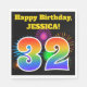 Este divertido y vibrante diseño de servilletas de papel presenta un colorido patrón inspirado en fuegos artificiales de celebración, junto con el número "32" que tiene un patrón multicolor inspirado en el arcoiris, sobre un fondo de color negro. También incluye un nombre personalizado y un mensaje de evento. Las servilletas de papel como esta pueden ser usadas en un fiesta que se celebra para celebrar el 32 cumpleaños de alguien. [~Z0000326]