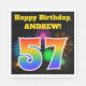 Este divertido y vibrante diseño de servilletas de papel presenta un patrón colorido inspirado en fuegos artificiales de celebración, junto con el número "57" que tiene un patrón gradiente multicolor inspirado en el arcoiris, sobre un fondo de color negro. También incluye un nombre de personalizable y un mensaje de evento. Las servilletas de papel como esta podrían ser usadas en una fiesta de cumpleaños que se lleva a cabo para celebrar el 57 cumpleaños de alguien. [~Z0000326]