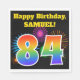 Este divertido y vibrante diseño de servilletas de papel presenta un patrón colorido inspirado en fuegos artificiales de celebración, junto con el número "84" que tiene un patrón gradiente multicolor inspirado en el arcoiris, sobre un fondo de color negro. También incluye un nombre personalizado y un mensaje de evento. Las servilletas de papel como esta podrían ser usadas en una fiesta de cumpleaños para celebrar el cumpleaños ochenta y cuatro de alguien. [~Z0000326]