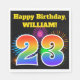 Este divertido y vibrante diseño de servilletas de papel presenta un patrón colorido inspirado en fuegos artificiales de celebración, junto con el número "23" que presenta un patrón gradiente inspirado en el arcoiris multicolor, sobre un fondo de color negro. También incluye un nombre personalizado y un mensaje de evento. Las servilletas de papel como esta podrían ser usadas en una fiesta de cumpleaños para celebrar el 23 cumpleaños de alguien. [~Z0000326]