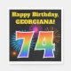 Este divertido y vibrante diseño de servilletas de papel presenta un patrón colorido inspirado en fuegos artificiales de celebración, junto con el número "74" que tiene un patrón gradiente multicolor inspirado en el arcoiris, sobre un fondo de color negro. También incluye un nombre de personalizable y un mensaje de evento. Las servilletas de papel como esta podrían ser usadas en una fiesta de cumpleaños para celebrar el cumpleaños setenta y cuatro de alguien. [~Z0000326]