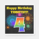 Este divertido y vibrante diseño de servilletas de papel presenta un colorido patrón inspirado en fuegos artificiales de celebración, junto con el número "4" que presenta un patrón de gradiente inspirado en un arcoíris multicolor, sobre un fondo de color negro. También presenta un nombre personalizable y un mensaje de evento. Servilletas de papel como esta podrían ser utilizadas en una fiesta que se celebra para conmemorar el cuarto cumpleaños de alguien.