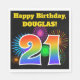 Este divertido y vibrante diseño de servilletas de papel presenta un colorido patrón inspirado en fuegos artificiales de celebración, junto con el número "21" que tiene un patrón de gradiente multicolor como un arcoíris, sobre un fondo de color negro. También incluye un nombre personalizable y un mensaje de evento. Servilletas de papel como esta podrían ser utilizadas quizás en una fiesta que se celebre para conmemorar el vigésimo primer cumpleaños de alguien. [~Z0000326]