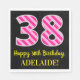 Este divertido diseño de servilletas de papel con temática de cumpleaños incluye un gran número "38" con un patrón de rayas rosa oscuro y rosa claro, junto con el mensaje "Feliz cumpleaños número 38", y un nombre personalizado. El fondo es negro de color. Las servilletas de papel con temas de cumpleaños como esta pueden ser divertidas de usar en un fiesta que se celebra para celebrar el 38 cumpleaños de alguien. [~Z0000380]