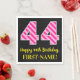 Este divertido diseño de servilletas de papel con temática de cumpleaños presenta un gran número "44", con un patrón de rayas rosa oscuro y rosa claro. También incluye el mensaje "Feliz cumpleaños número 44", y un nombre personalizado. El fondo es negro de color. Las servilletas de papel con temática de cumpleaños como esta podrían ser usadas en un fiesta que celebra el 44 cumpleaños de alguien. [~Z0000380]
