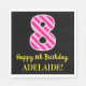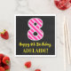 Este divertido diseño de servilletas de papel con temática de cumpleaños presenta un gran número "8" con un patrón de rayas rosa claro y rosa oscuro, junto con el mensaje "Feliz octavo cumpleaños", y un nombre de personalizable. El fondo es negro de color. Unas toallas de papel con tema de cumpleaños personalizadas y divertidas como esta podrían ser usadas en la fiesta de cumpleaños número 8 de alguien. [~Z0000380]