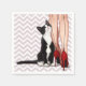 Magnífico ilustracion de gato blanco y negro inclinado sobre las piernas de una mujer, sobre el fondo de patrón de chevron, diseñado por la artista Maryline Cazenave.