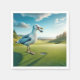 Una gaviota se alza sobre un campo de golf verde y exuberante, sosteniendo una pelota de golf en su pico cerca de un hoyo
