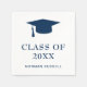 La moderna servilleta de graduación con un diseño simple y masculino con "Clase de Año" en una tipografía en negrita grande junto con una tapa de grado y el nombre del graduado en azul marino sobre un fondo blanco. Estas servilletas son perfectas para un graduado y son una excelente manera de agregar un toque personal a tu fiesta de graduación.