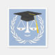 Las servilletas creativas del partido de graduación de la escuela de derecho presentan una escala de justicia única personificada con una gorra negra y dorada.