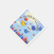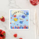 Para una fiesta de graduación, estas servilletas están decoradas con una escena de coloridos tapones de graduación en el aire, mostrados contra un cielo azul con nubes esponjosas junto con un nombre y un año para que lo personalizes.