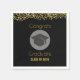 Toallas de papel con texto que dice : Felicitaciones Graduado. Escrito en un estilo de letra moderno de color dorado. Ilustrado con un tapón de graduación con un círculo blanco semitransparente detrás. Fijado sobre un fondo negro. Purpurina confetti color oro falso salpicado por la parte superior. Clase de 20xx en la parte inferior para ser personalizada con el año.
