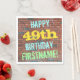 Este divertido diseño de pañuelos de papel con temática de cumpleaños incluye un mensaje como "¡FELIZ CUMPLEAÑOS 49, NOMBRE DE PELO!", donde el nombre se puede personalizar. El fondo está representado por una pared de ladrillo de ladrillo marrón rojizo. El texto del mensaje de personalizable presenta colores como azul, amarillo y verde, y tiene un aspecto inspirado en el de los graffitis pintados. Las servilletas como estas podrían ser usadas en una fiesta de cumpleaños para alguien que está celebrando su cumpleaños cuarenta y nueve. [~Z0000271]