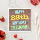 Este divertido diseño de pañuelos de papel con temática de cumpleaños incluye un mensaje como "¡FELIZ 88º CUMPLEAÑOS, FIRSTNAME!", donde el nombre se puede personalizar. El fondo está representado por una pared de ladrillo de ladrillo marrón rojizo. El texto del mensaje de personalizable presenta colores como azul, amarillo y verde, y tiene un aspecto inspirado en el de los graffitis pintados. Las servilletas como estas podrían ser usadas en una fiesta de cumpleaños para alguien que esté celebrando su ochenta y ocho cumpleaños. [~Z0000271]