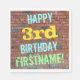 Este divertido diseño de pañuelos de papel con temática de cumpleaños incluye un mensaje como "¡FELIZ tercer cumpleaños, FIRSTNAME!", donde el nombre se puede personalizar. El fondo está representado por una pared de ladrillo de ladrillo marrón rojizo. El texto del mensaje de personalizable presenta colores como azul, amarillo y verde, y tiene un aspecto inspirado en el de los graffitis pintados. Las servilletas como estas podrían ser usadas en una fiesta de cumpleaños para alguien que esté celebrando su tercer cumpleaños. [~Z0000271]