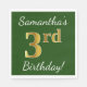 Este sencillo diseño de servilletas de papel muestra un mensaje como "¡El tercer cumpleaños de Samantha!", con el "tercero" en falso aspecto dorado, en un fondo de color verde. El nombre se puede personalizar. Se podría usar en una fiesta de cumpleaños para alguien que esté celebrando su tercer cumpleaños. [~Z0000081]