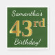 Este sencillo diseño de servilletas de papel muestra un mensaje como "¡Cumpleaños 43 de Samantha!", con el "43" en un falso aspecto dorado, en un fondo verde de color. El nombre se puede personalizar. Podría ser usado en una fiesta de cumpleaños para alguien que está celebrando su 43 cumpleaños. [~Z0000081]