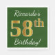 Este sencillo diseño de servilletas de papel muestra un mensaje como "¡El cumpleaños 58 de Riccardo!", con el "58" en apariencia de oro falso, sobre un fondo de color verde. El nombre se puede personalizar. Se podría usar en una fiesta de cumpleaños para alguien que esté celebrando su cincuenta y ocho cumpleaños. [~Z0000081]