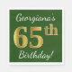 Este sencillo diseño de servilletas de papel muestra un mensaje como "¡Cumpleaños 65 de Georgiana!", con el "65″ que tiene una apariencia falsa de oro, en un fondo verde de color. El nombre se puede personalizar. Se podría usar en una fiesta de cumpleaños para alguien que esté celebrando su sexagésimo quinto cumpleaños. [~Z0000081]