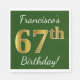Este sencillo diseño de servilleta de papel muestra un mensaje como "¡Cumpleaños 67 de Francisco!", con el "67" en un falso aspecto dorado, en un fondo verde de color. El nombre se puede personalizar. Se podría usar en una fiesta de cumpleaños para alguien que esté celebrando su sexagésimo séptimo cumpleaños. [~Z0000081]
