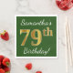 Este sencillo diseño de servilletas de papel muestra un mensaje como "¡Cumpleaños 79 de Samantha!", con el "79" en un falso aspecto dorado, en un fondo de color verde. El nombre se puede personalizar. Podría ser usado en una fiesta de cumpleaños para alguien que está celebrando su cumpleaños setenta y nueve. [~Z0000081]