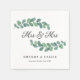 Las servilletas de boda lesbiana con la Sra. y la Sra. escritas en un hermoso guión con un grabador de bonito y enmarcadas por ramas verdes curvadas alrededor del texto en tonalidades mudas de verde fresco.