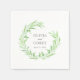 Una servilleta de papel boda contemporánea con una corona de laurel a acuarela abierta en delicados tonos verdes. La vegetación floral es una elección versátil que se coordina con cualquier esquema de color que planee para su día especial. Introduzca sus detalles en lugar del texto de ejemplo que se muestra.