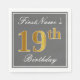 Este sencillo y elegante diseño de servilletas de papel presenta un mensaje como "Cumpleaños 19 del Nombre" (con el "19" que tiene un falso color dorado) dentro de un área cuadrada de color gris con un simple contorno de borde. El nombre está en un texto similar a un guión de color blanco y se puede personalizar. Las servilletas como estas podrían ser usadas en una fiesta de cumpleaños para alguien que está celebrando su decimonoveno cumpleaños. [~Z0000191]