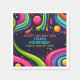 Invitación de cumpleaños vibrante y divertida con un diseño psicodélico de inspiración retro. El fondo oscuro está decorado con formas coloridas y agitadas, líneas abstractas y tonalidades de colores que recuerdan a los años 70. El borde es un patrón divertido de caras sonrientes multicolores, con estrellas y burbujas dispersas por todo el diseño. El texto es una mezcla de fuentes atrevidas y juguetonas, con detalles clave resaltados en azul brillante y rosa.