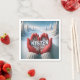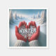 Copos de nieve sobre guantes rojos en una escena de bosques de invierno con texto de INVIERNO.