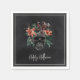 Un espeluznante diseño de moda de Halloween con un ilustracion tropical floral de cráneo coronado con flores de naranja y de la isla de Borgoña y vegetación selvática verde sobre un fondo negro humeante. Personalice esta singular y elegante servilleta de papel de Halloween con texto personalizado; mostrada con "Halloween feliz".