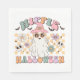 Cuidada, colorida, divertida servilleta de papel hippie de Halloween incluye un fantasma hippie con gorra de brujas rosa, texto que lee Halloween hippie, y algunas flores y pequeños murciélagos y cráneos en lavanda, melón, agua y rosa!
